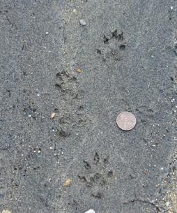 piles of otters with tracks and slides perpendicular to the water and raccoon trails parallel to it.